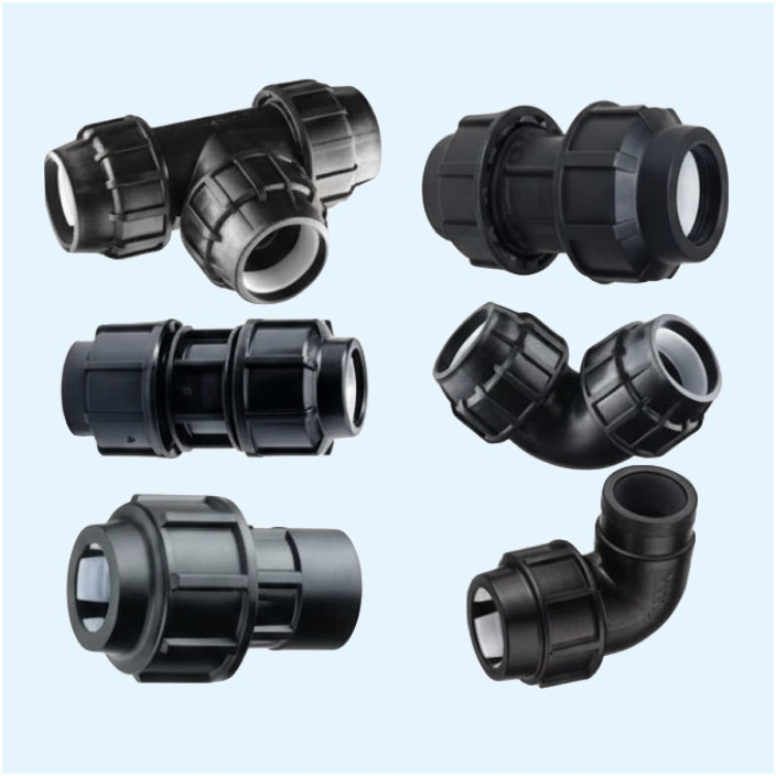 Фитинги компрессионные ПНД производятся различных форм и типов: муфты, тройники, отводы, фланцевые соединения и заглушки, так же они могут иметь наружную или внутреннюю резьбу. Компрессионные фитинги для труб ПНД производятся с различными внутренними диаметрами от 16 до 110 мм и имеют разное рабочее давление от 10 до 16 Bar (атмосфер): с рабочим давлением 10-16 Bar(атмосфер) производятся с диаметрами 16-110 мм, с рабочим давлением до 16 Bar (атмосфер) производятся с диаметрами 16-63 мм, с рабочим давлением до 12,5 Bar (атмосфер) производятся с диаметрами 75-110 мм.