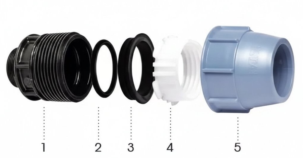 Компрессионный фитинг состоит из 5 модульных элементов: