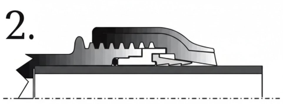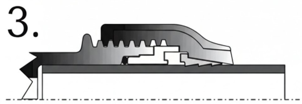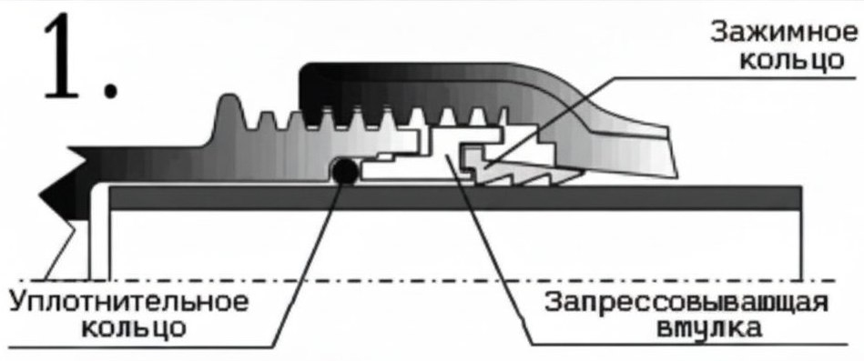 3-Зажимное кольцо-втулка, производится из сополимера полипропилена, выполняет запрессовывающую функцию, фиксирует уплотнительное кольцо в устойчивом положении и ограничивает деформацию и выбрасывания трубы.