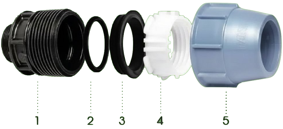 Компрессионный фитинг состоит из 5 модульных элементов:
